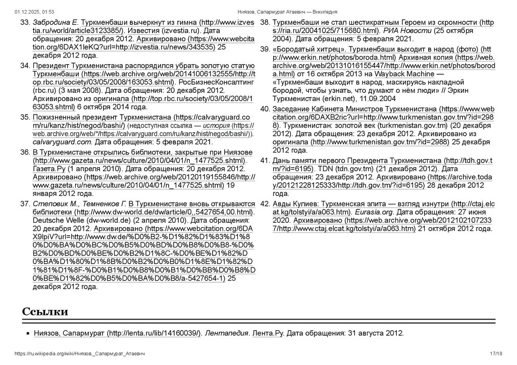 33. Забродина Е. Туркменбаши вычеркнут из гимна (http://www.izves 38. Туркменбаши не стал шестикратным Героем из скромности (http