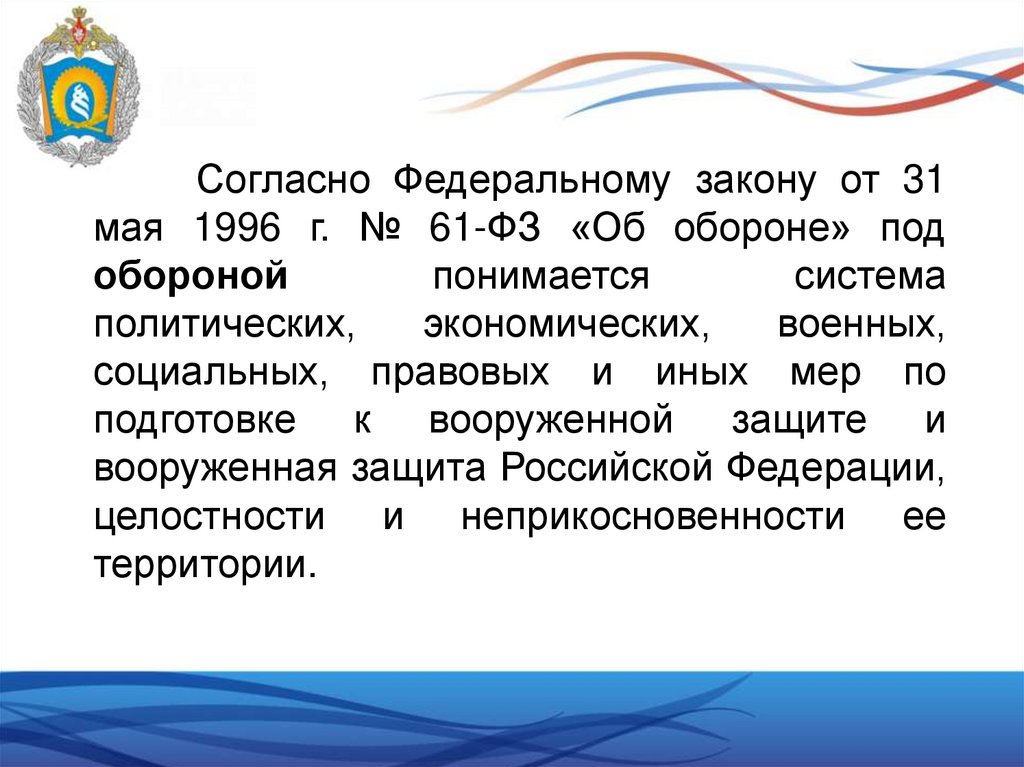 Согласно Федеральному закону от 31мая 1996 г. № 61-ФЗ «Об обороне» под