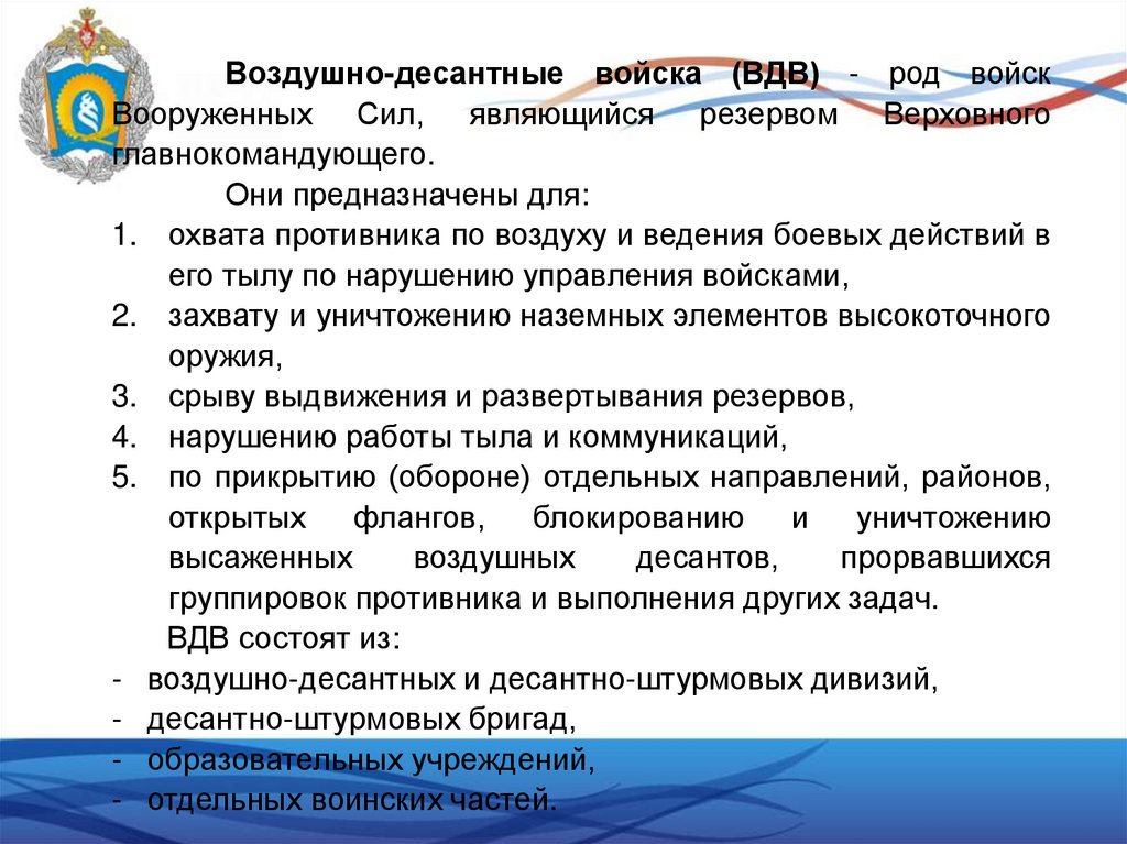 РОДА ВОЙСК ВООРУЖЕННЫХ СИЛВОЗДУШНО-ДЕСАНТНЫЕ ВОЙСКА.