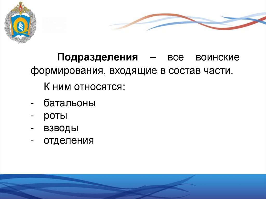 Подразделения – все воинскиеформирования, входящие в состав части.