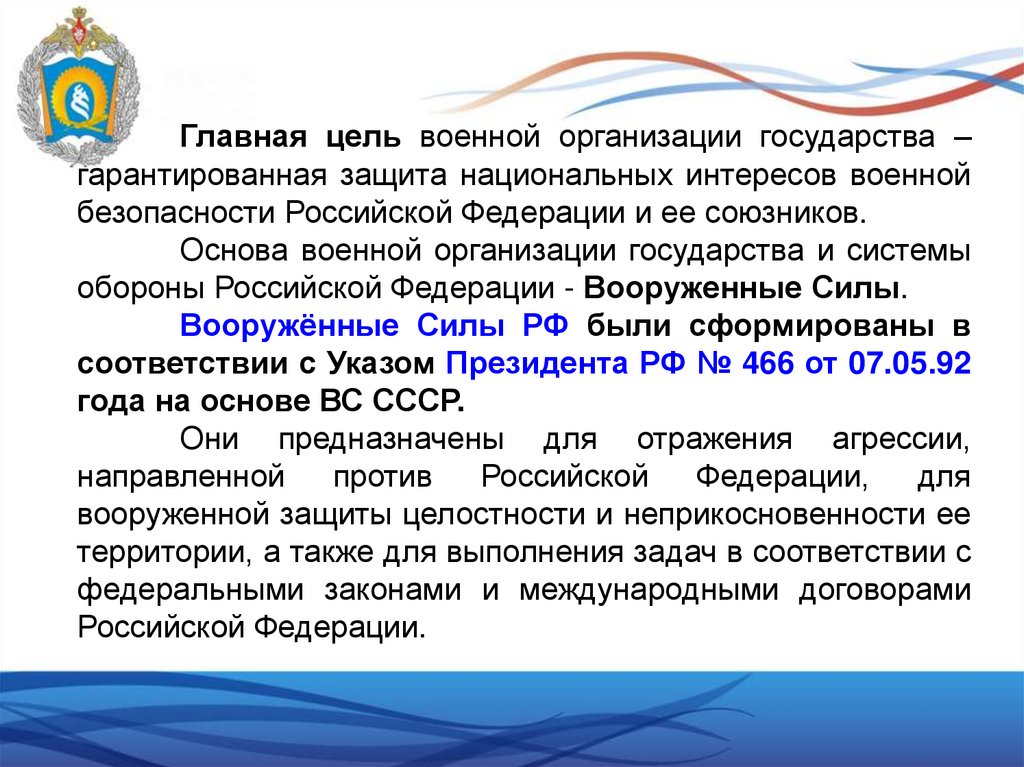 Главная цель военной организации государства –гарантированная защита национальных интересов военной