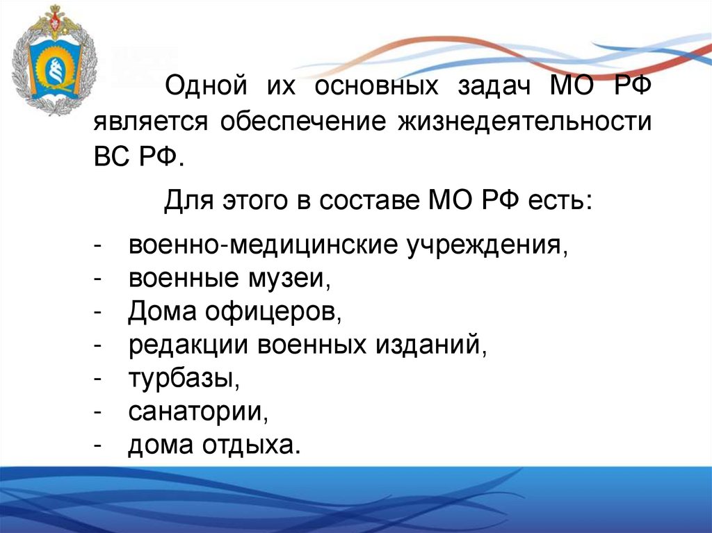 Одной их основных задач МО РФявляется обеспечение жизнедеятельности