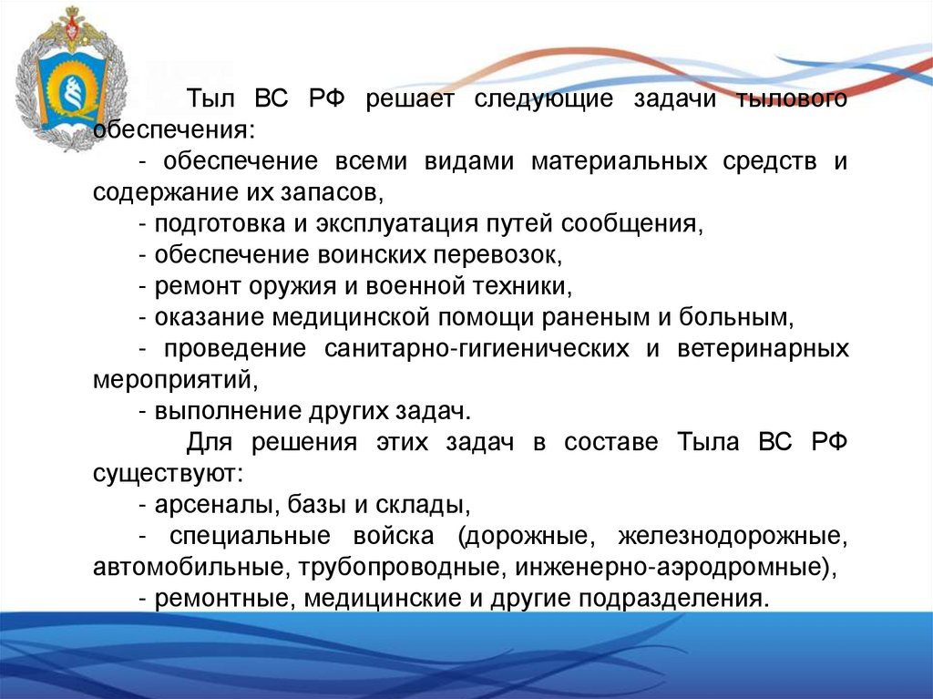 Тыл ВС РФ решает следующие задачи тыловогообеспечения: