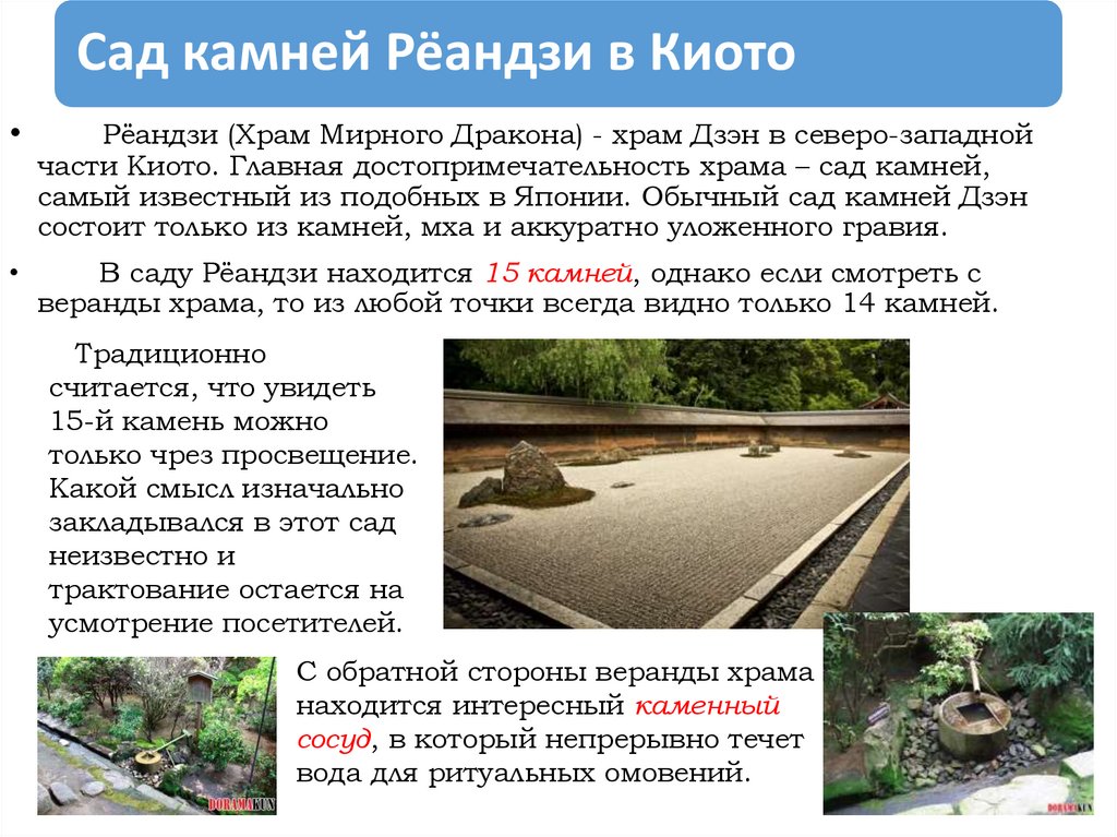 самый известный из подобных в Японии. Обычный сад камней Дзэн