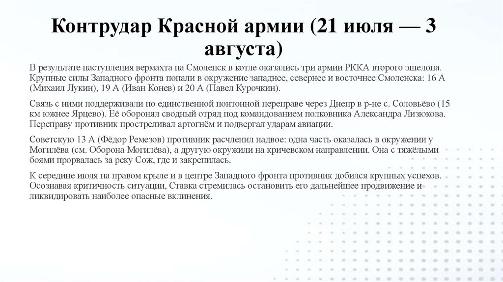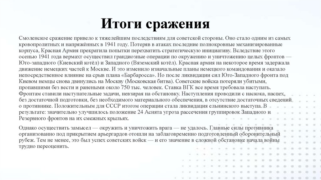 Итоги сраженияСмоленское сражение привело к тяжелейшим последствиям для советской стороны. Оно стало одним из самых