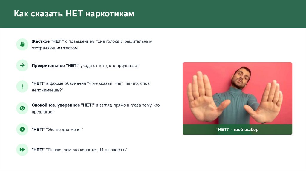 Как сказать НЕТ наркотикамЖесткое "НЕТ!" с повышением тона голоса и решительным