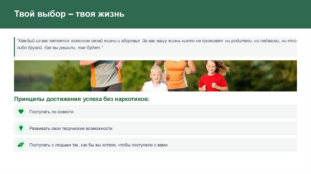 Твой выбор – твоя жизнь"Каждый из вас является хозяином своей жизни и здоровья. За вас вашу жизнь никто не проживет: ни родители, ни педагоги, ни ктолибо другой. Как вы решили, так будет."