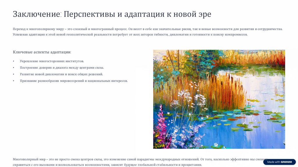 Заключение: Перспективы и адаптация к новой эреПереход к многополярному миру – это сложный и многогранный процесс. Он несет в себе как значительные риски, так и новые возможности для развития и сотрудничества.