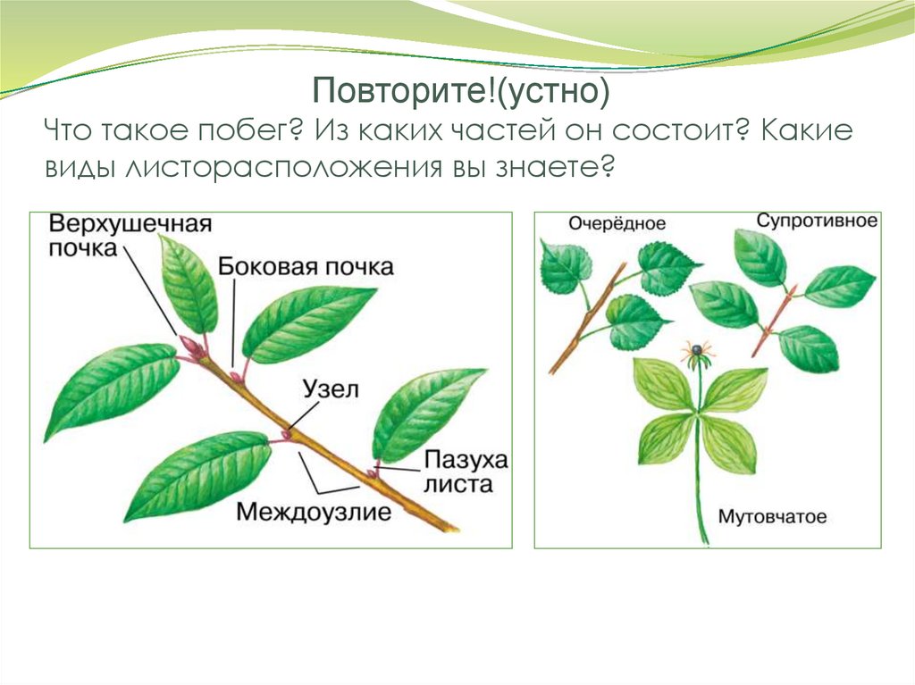 1. Повторите!(устно) Что такое побег? Из каких частей он состоит? Какие виды листорасположения вы знаете?