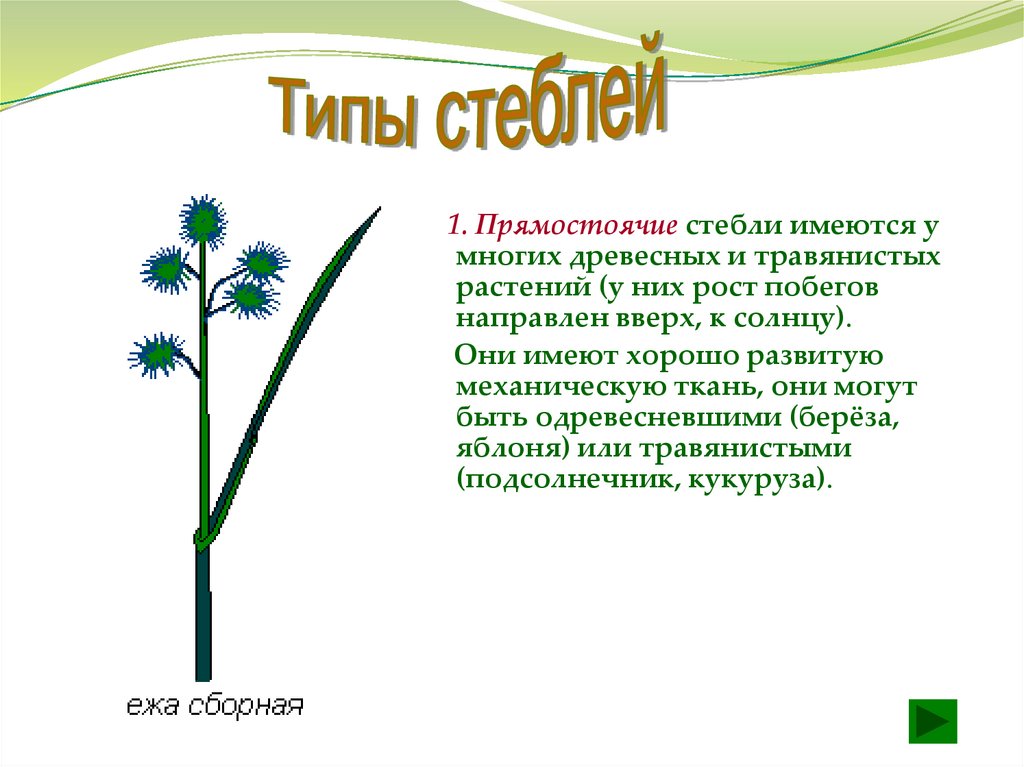 1. Прямостоячие стебли имеются умногих древесных и травянистых