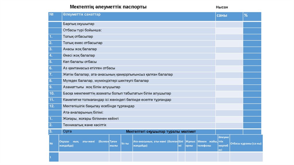 1) мектептің әлеуметтік паспортын (қағаз немесе электрондық word немесе pdf форматында);