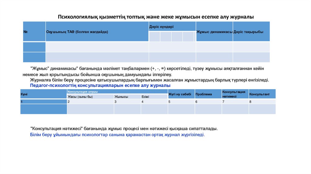 1) психологиялық қызметтің топтық және жеке жұмысын есепке алу журналын