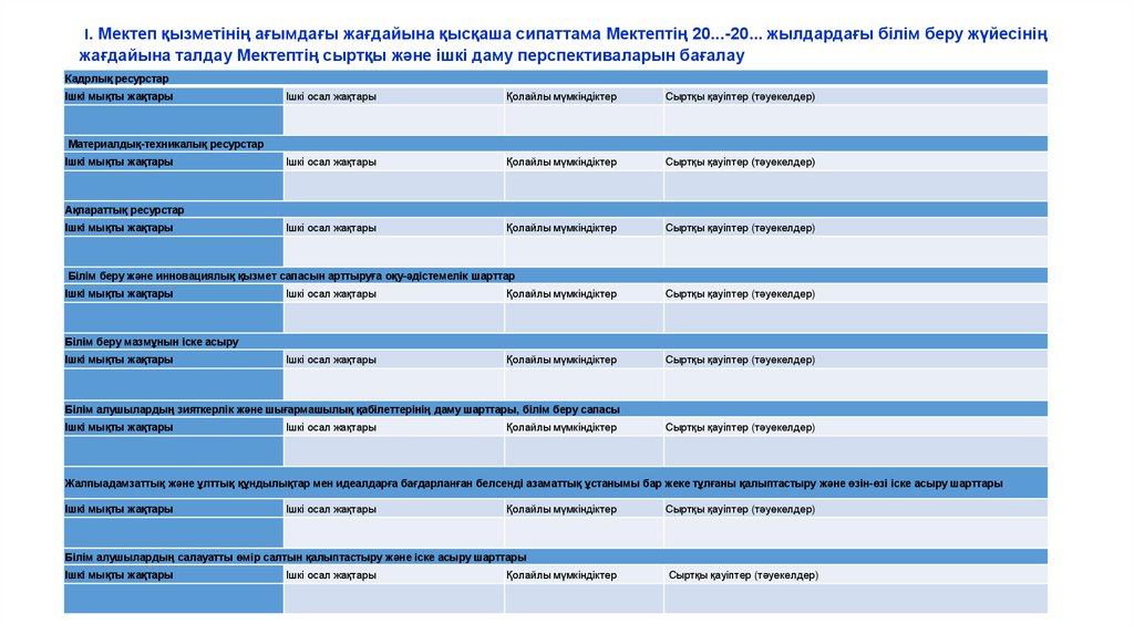 I. Мектеп қызметінің ағымдағы жағдайына қысқаша сипаттама Мектептің 20...-20... жылдардағы білім беру жүйесініңжағдайына талдау Мектептің сыртқы және ішкі даму перспективаларын бағалау
