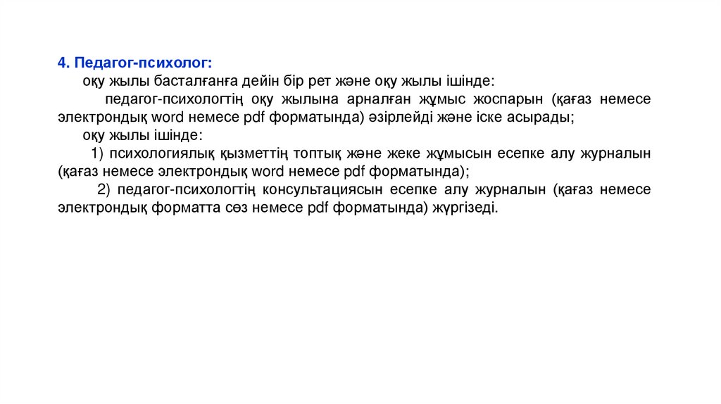 4. Педагог-психолог:оқу жылы басталғанға дейін бір рет және оқу жылы ішінде: