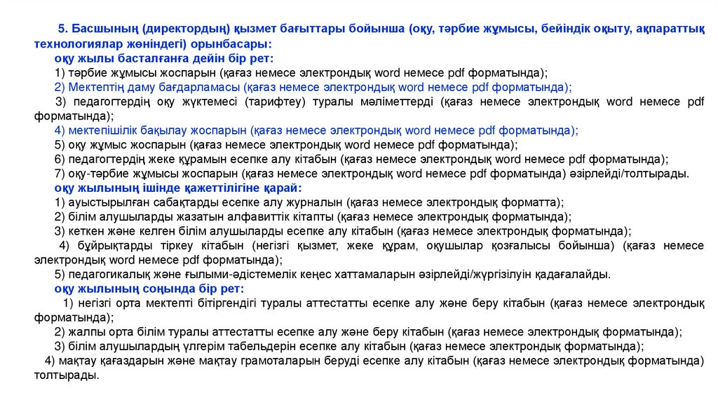 5. Басшының (директордың) қызмет бағыттары бойынша (оқу, тәрбие жұмысы, бейіндік оқыту, ақпараттықтехнологиялар жөніндегі) орынбасары: