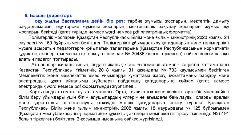 6. Басшы (директор):оқу жылы басталғанға дейін бір рет: тәрбие жұмысы жоспарын, мектептің дамыту