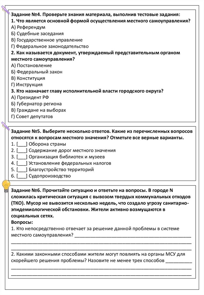 Задание №4. Проверьте знания материала, выполнив тестовые задания:1. Что является основной формой осуществления местного самоуправления?