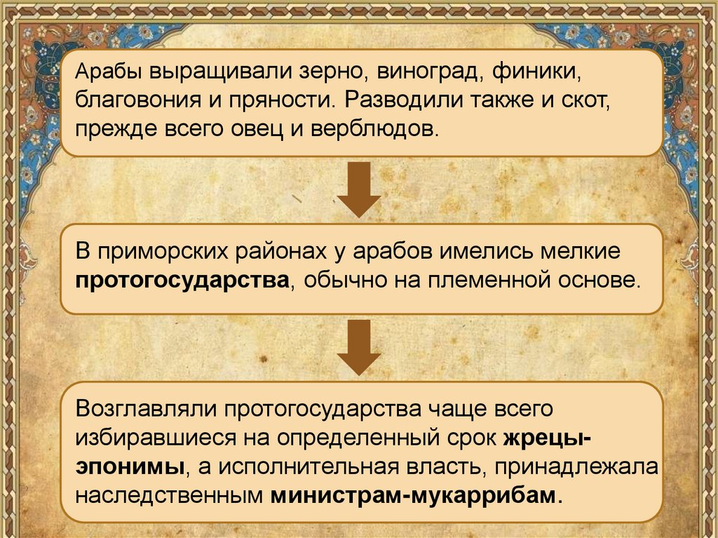 Арабы выращивали зерно, виноград, финики,благовония и пряности. Разводили также и скот,