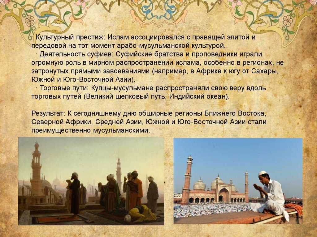 · Культурный престиж: Ислам ассоциировался с правящей элитой ипередовой на тот момент арабо-мусульманской культурой.