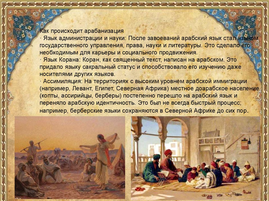 Как происходит арабанизация· Язык администрации и науки: После завоеваний арабский язык стал языком
