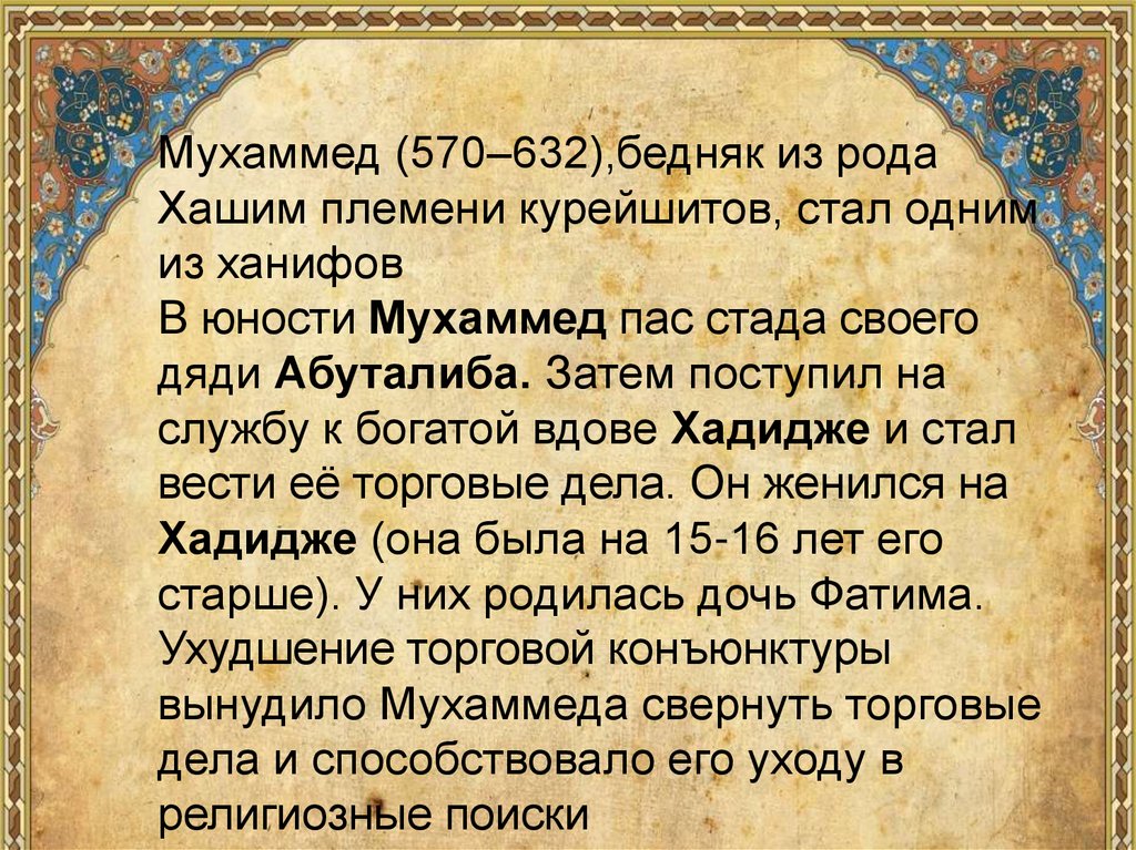 Мухаммед (570–632),бедняк из родаХашим племени курейшитов, стал одним