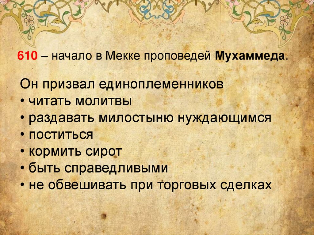 610 – начало в Мекке проповедей Мухаммеда.Он призвал единоплеменников