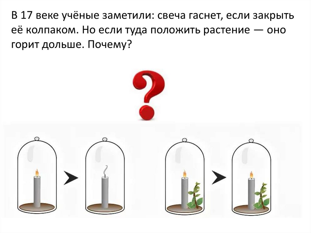 В 17 веке учёные заметили: свеча гаснет, если закрытьеё колпаком. Но если туда положить растение — оно