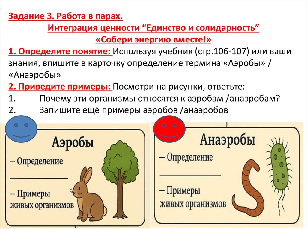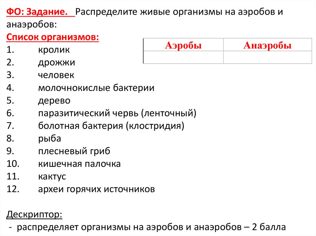 ФО: Задание. Распределите живые организмы на аэробов ианаэробов: