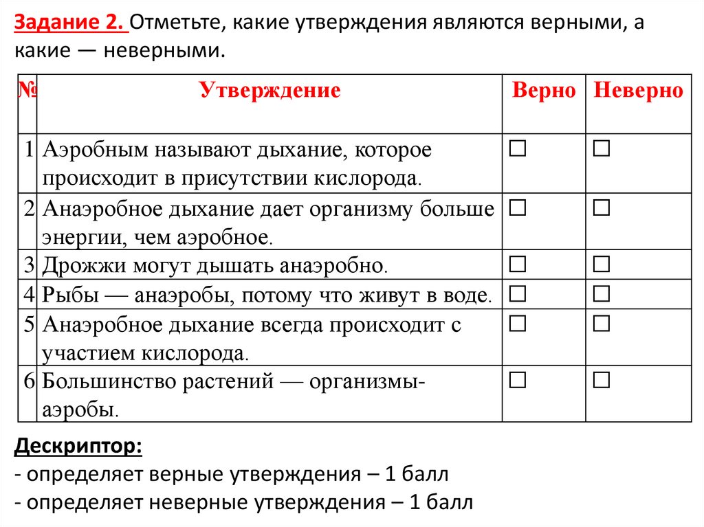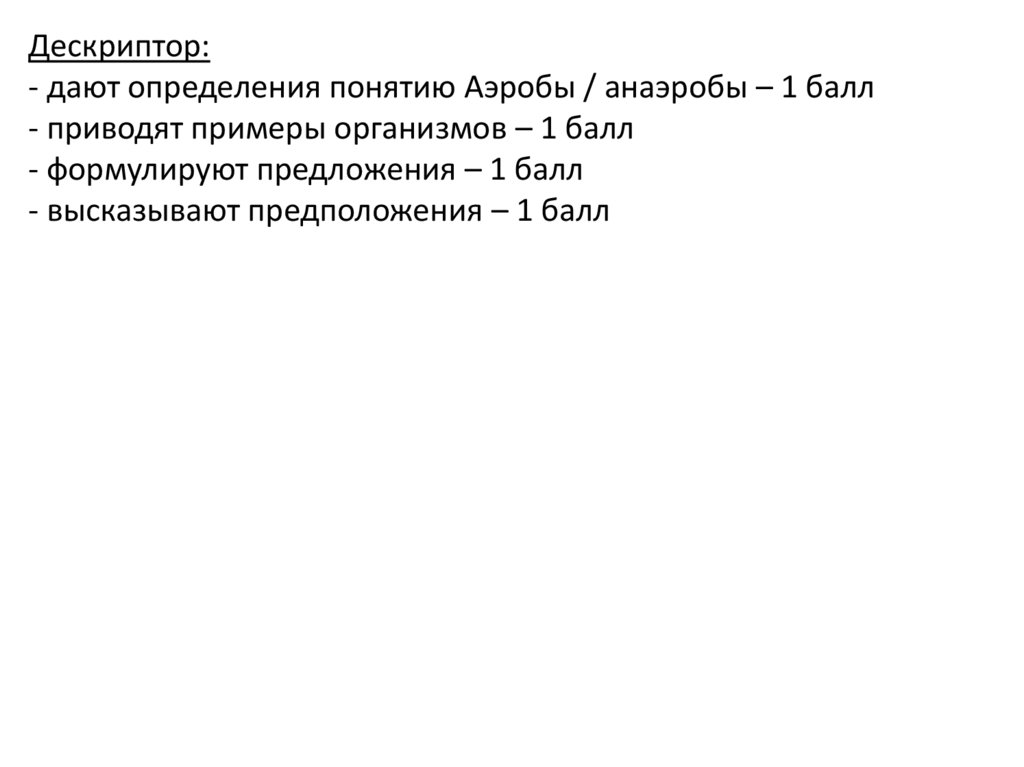 Дескриптор:- дают определения понятию Аэробы / анаэробы – 1 балл