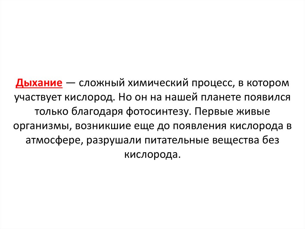 Дыхание — сложный химический процесс, в которомучаствует кислород. Но он на нашей планете появился