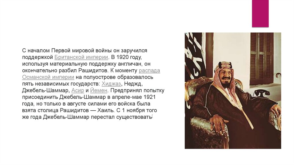 1902 по 1926 год и эмир Неджда и Хасы с 1913 по 1921 год. Позже