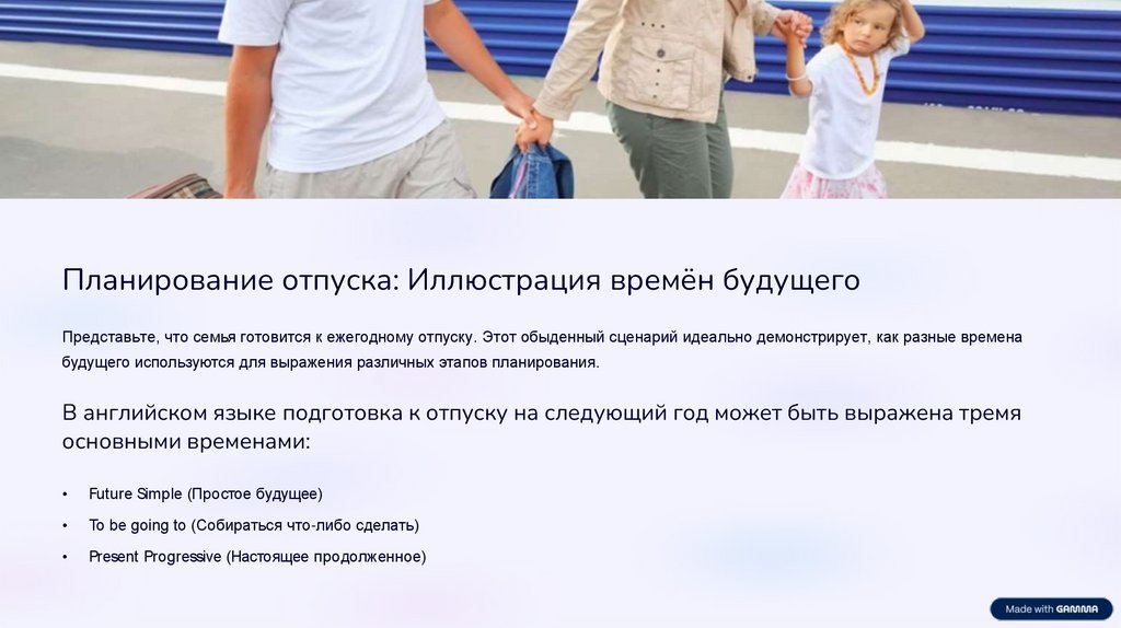 Планирование отпуска: Иллюстрация времён будущегоПредставьте, что семья готовится к ежегодному отпуску. Этот обыденный сценарий идеально демонстрирует, как разные времена