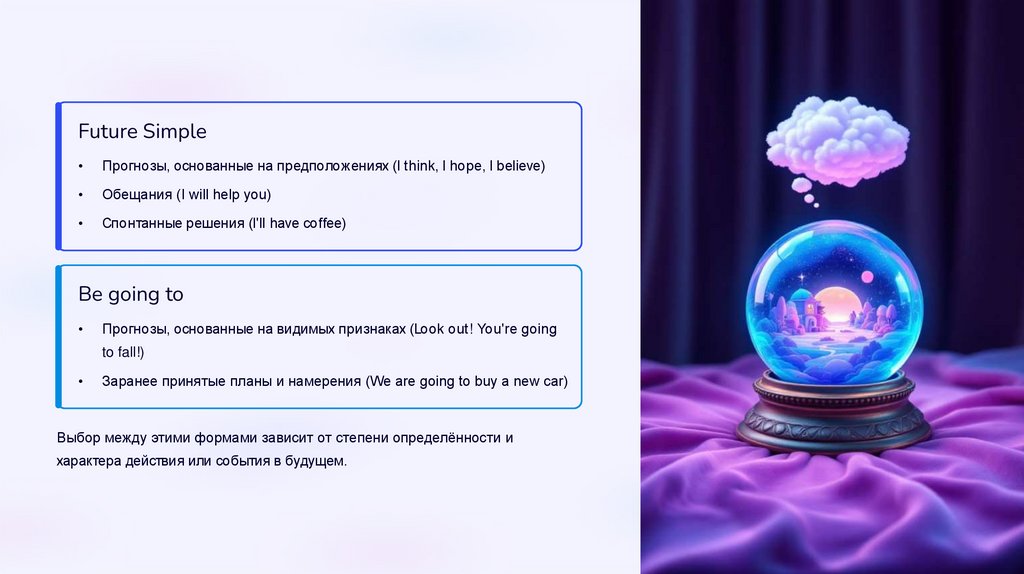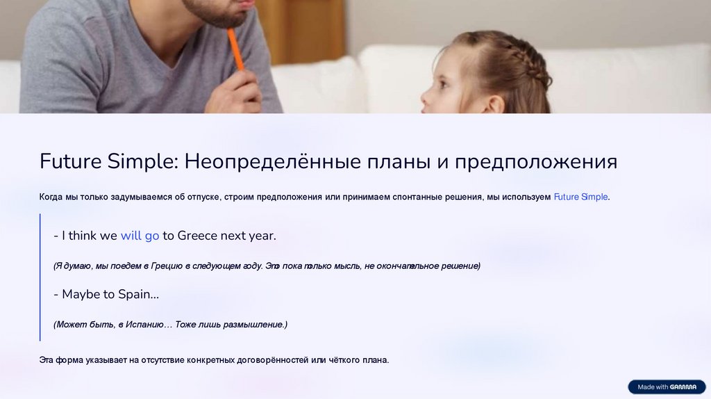 Future Simple: Неопределённые планы и предположенияКогда мы только задумываемся об отпуске, строим предположения или принимаем спонтанные решения, мы используем Future Simple.