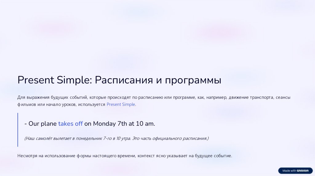 Present Simple: Расписания и программыДля выражения будущих событий, которые происходят по расписанию или программе, как, например, движение транспорта, сеансы