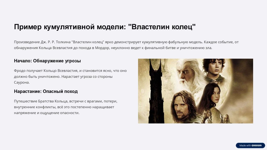 Пример кумулятивной модели: "Властелин колец"Произведение Дж. Р. Р. Толкина "Властелин колец" ярко демонстрирует кумулятивную фабульную модель. Каждое событие, от