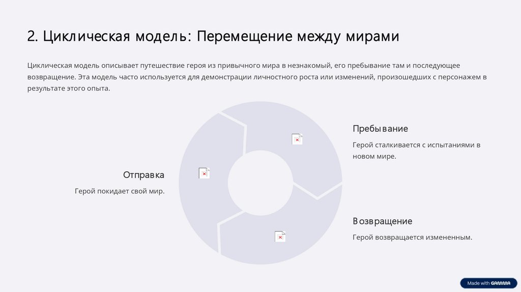 2. Цикл ическая модел ь : Перемещение между мирамиЦиклическая модель описывает путешествие героя из привычного мира в незнакомый, его пребывание там и последующее