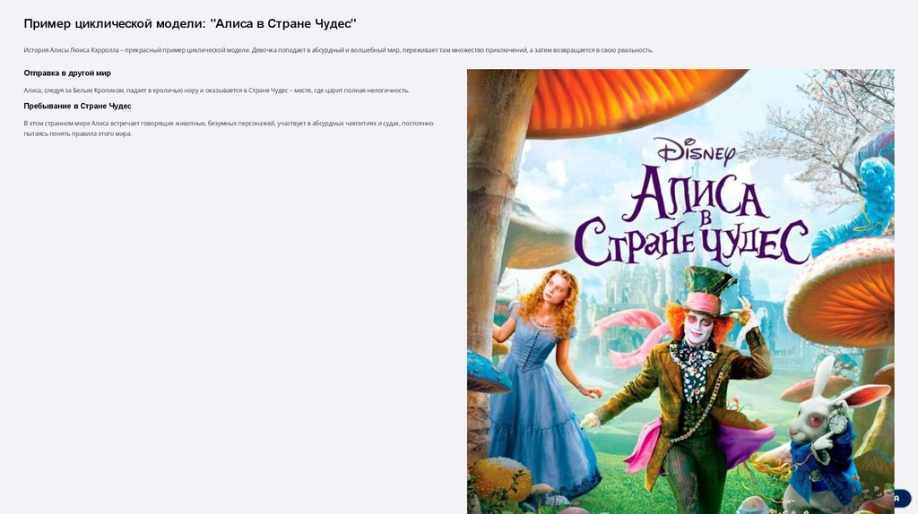 Пример циклической модели: "Алиса в Стране Чудес"История Алисы Люиса Кэрролла – прекрасный пример циклической модели. Девочка попадает в абсурдный и волшебный мир, переживает там множество приключений, а затем возвращается в свою реальность.