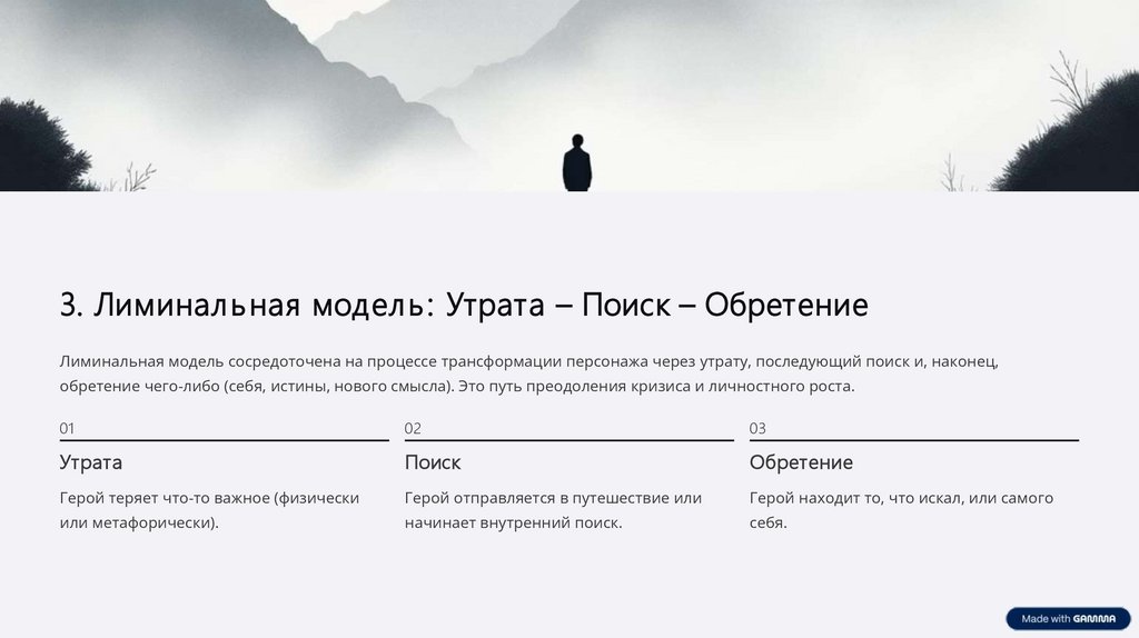 3. Лиминал ь ная модел ь : Утрата – Поиск – ОбретениеЛиминальная модель сосредоточена на процессе трансформации персонажа через утрату, последующий поиск и, наконец,