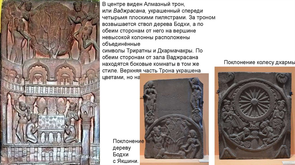 В центре виден Алмазный трон,или Ваджрасана, украшенный спереди