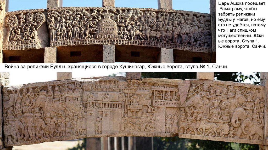 Война за реликвии Будды, хранящиеся в городе Кушинагар, Южные ворота, ступа № 1, Санчи.