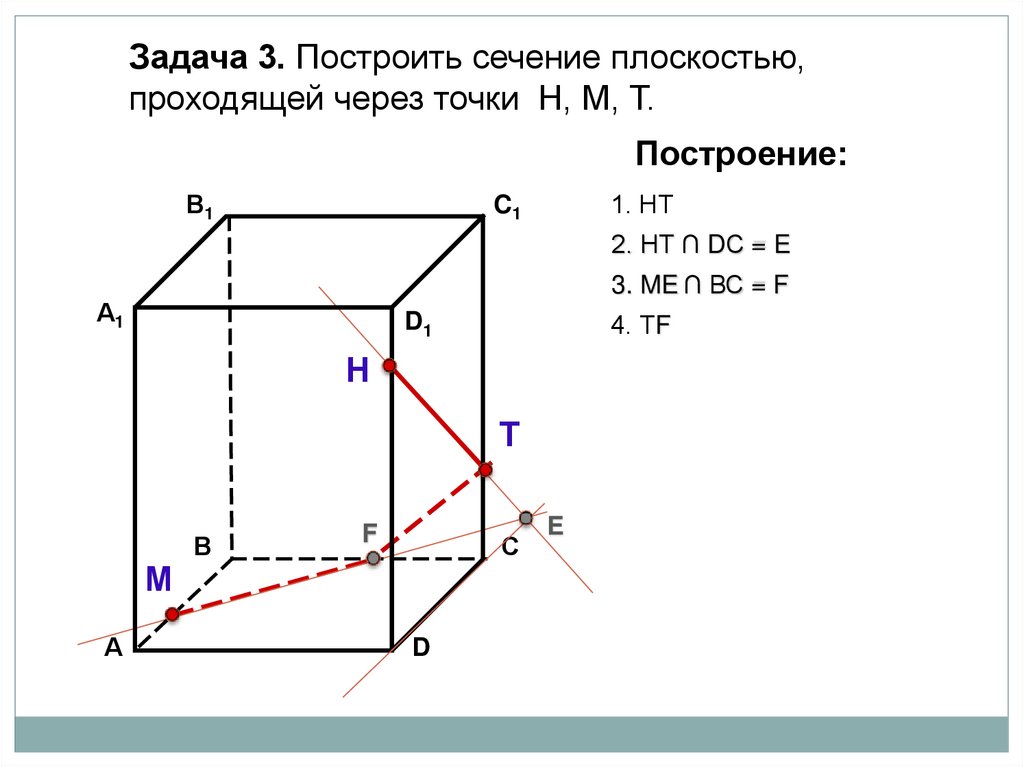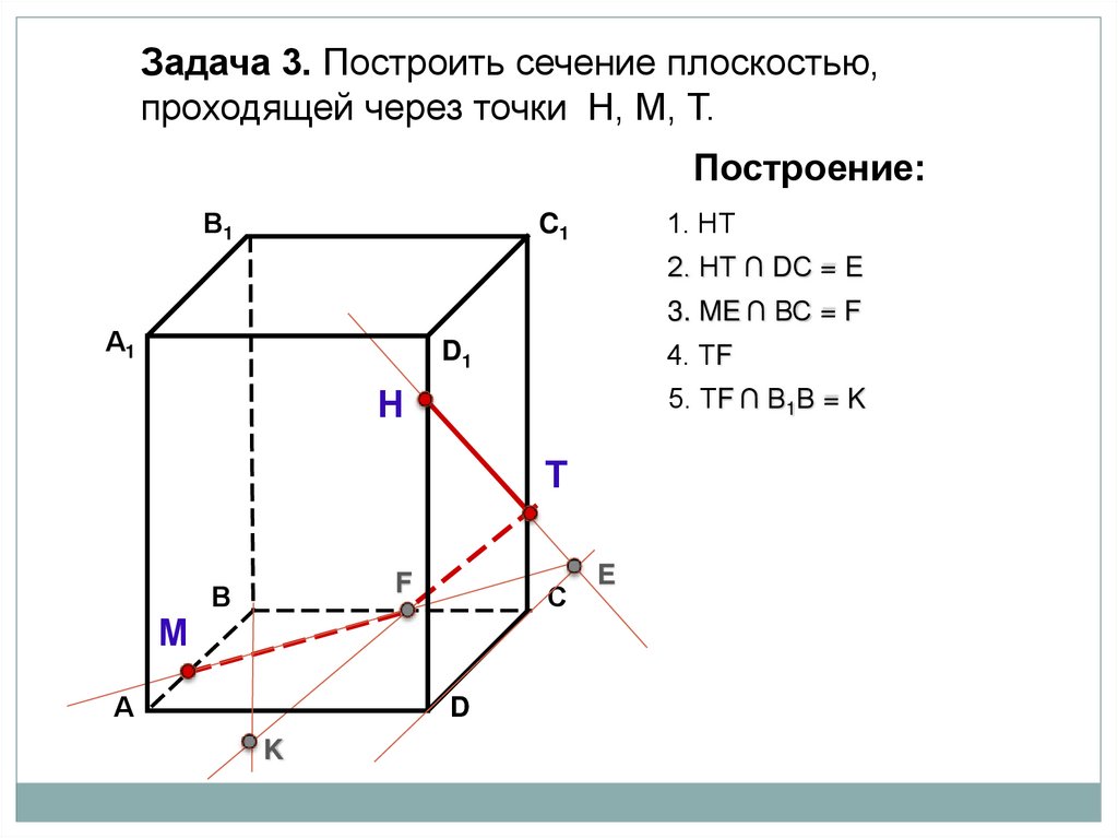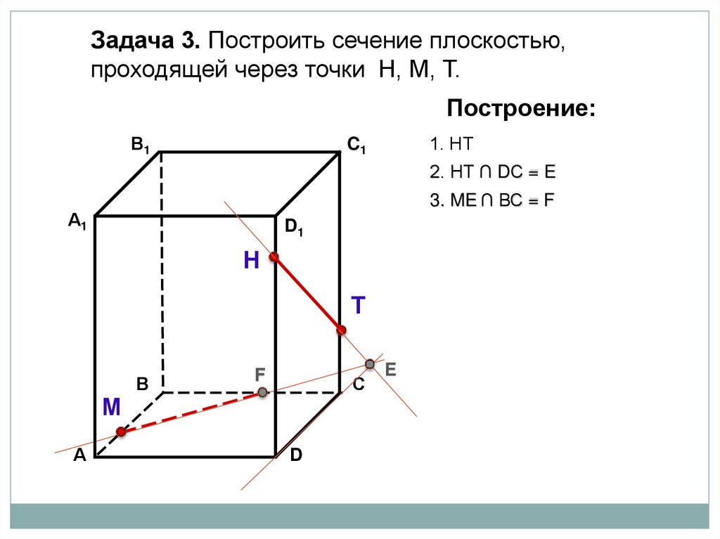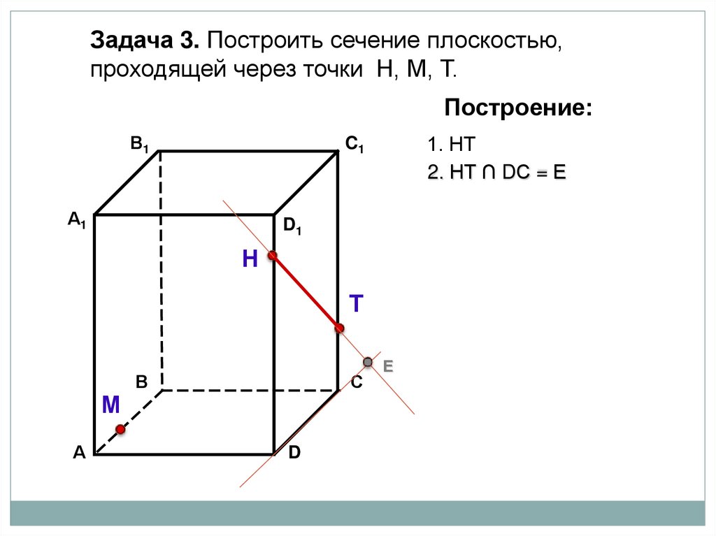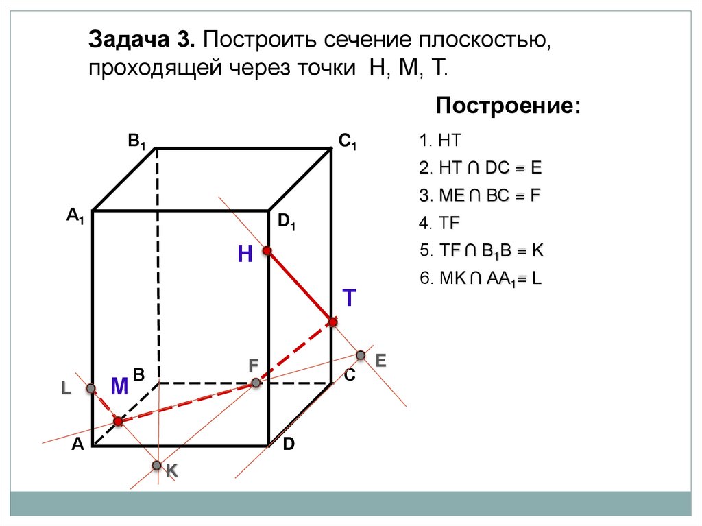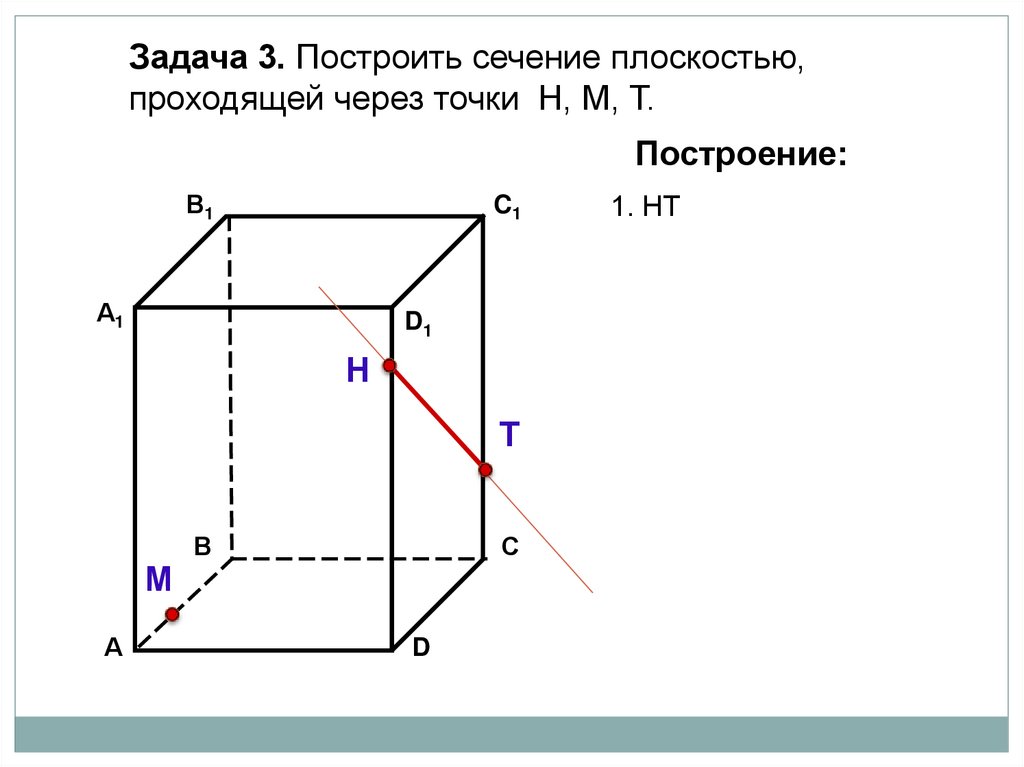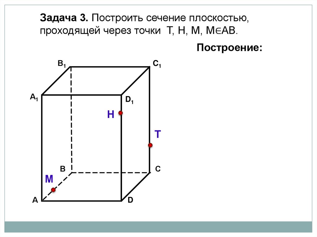 Для построения сечения нужно построитьточки пересечения секущей плоскости с