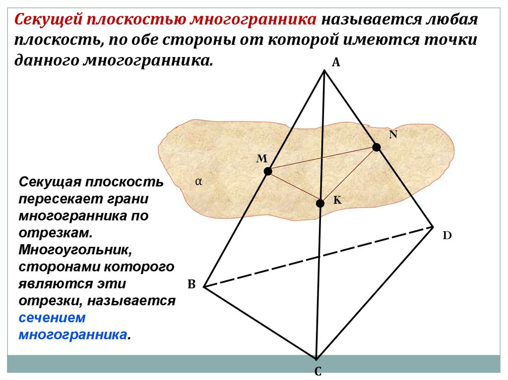 Секущей плоскостью многогранника называется любаяплоскость, по обе стороны от которой имеются точки