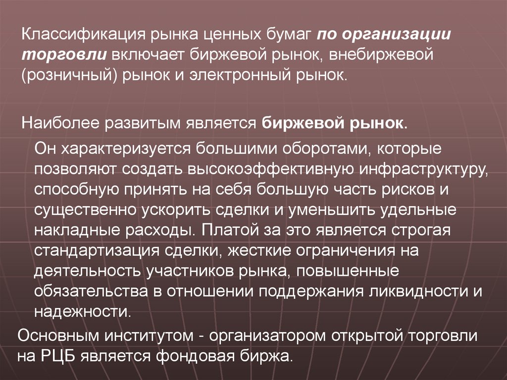 По типу организации:биржевой,