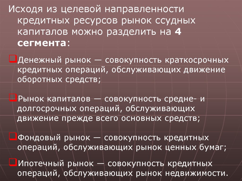 Исходя из целевой направленностикредитных ресурсов рынок ссудных