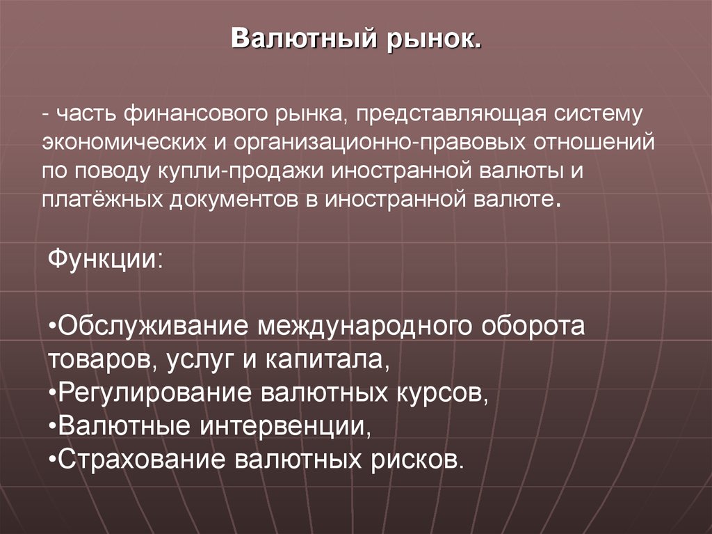 Валютный рынок.- часть финансового рынка, представляющая систему