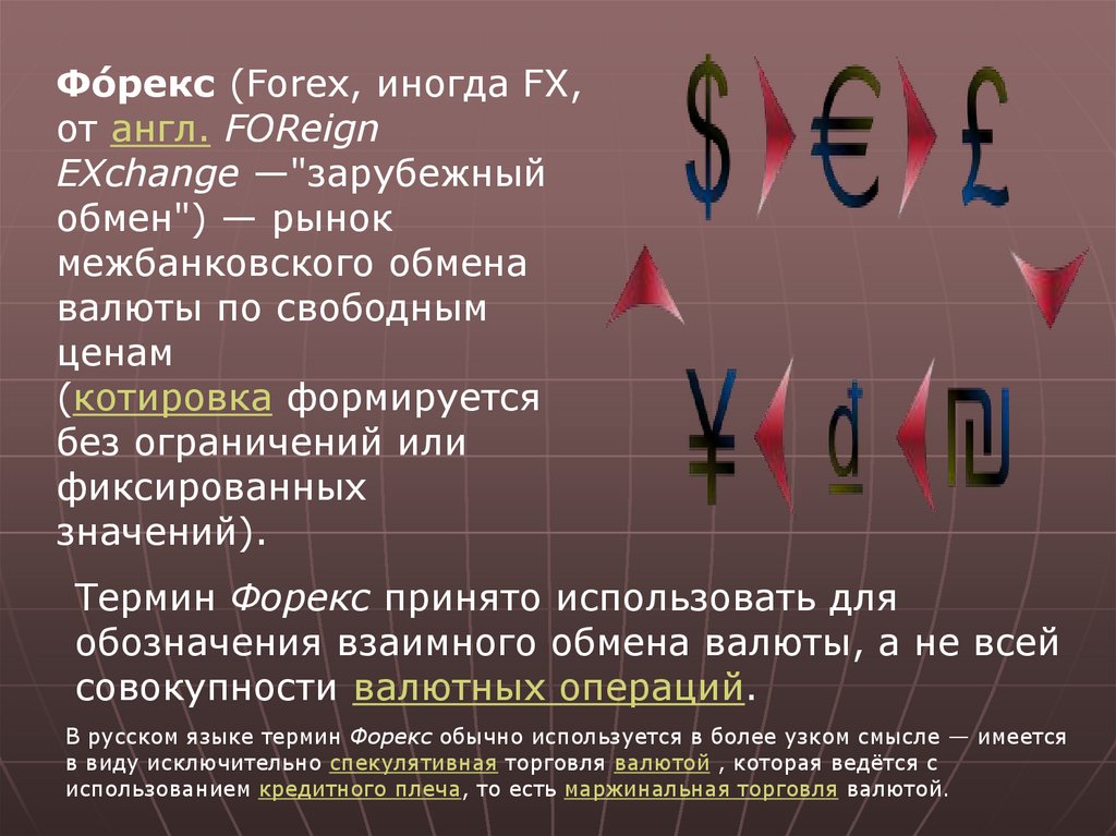 В русском языке термин Форекс обычно используется в более узком смысле — имеется