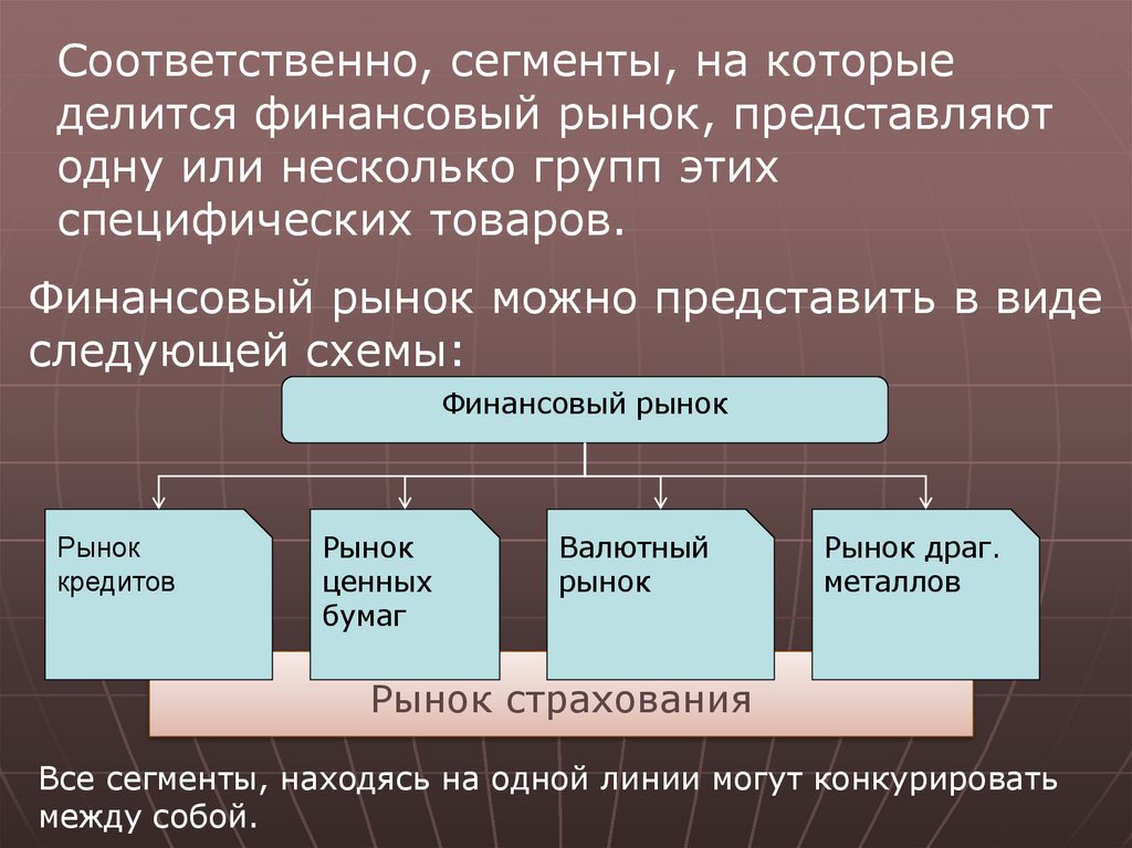 Соответственно, сегменты, на которыеделится финансовый рынок, представляют