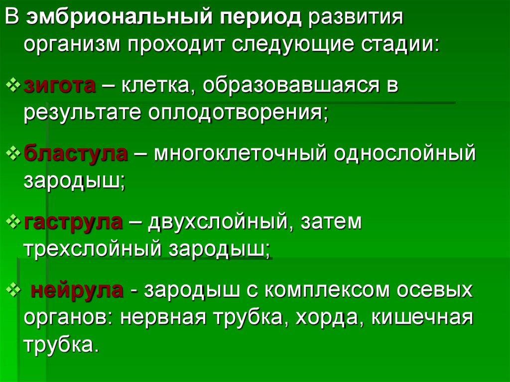 В эмбриональный период развитияорганизм проходит следующие стадии: