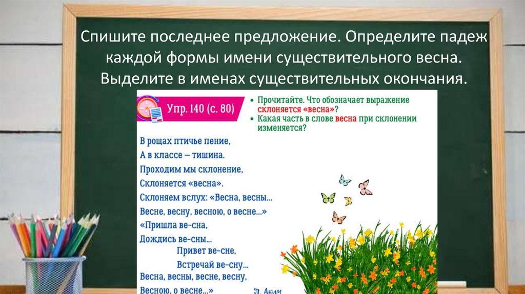 Спишите последнее предложение. Определите падежкаждой формы имени существительного весна.