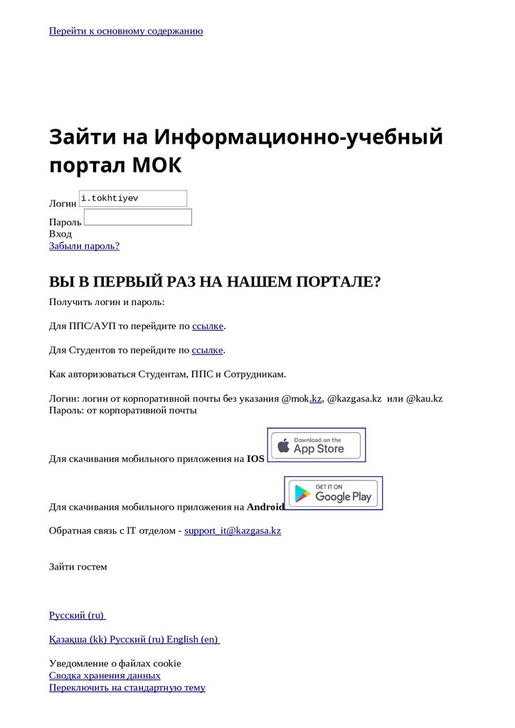 Логин: логин от корпоративной почты без указания @mok.kz, @kazgasa.kz или @kau.kz